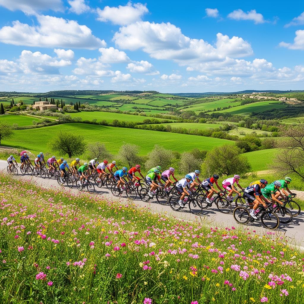 !Peloton kører gennem forårslandskab i Sydfrankrig under Paris-Nice 2026
